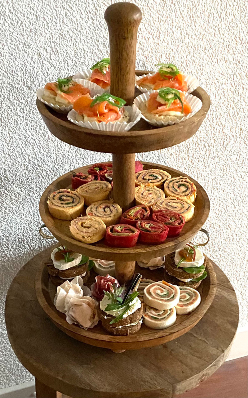 Schaal met diverse luxe door Ambiente gesorteerde hapjes, sandwiches en wraps. Borrelplank met exclusieve vlees, vis, kaas en vegan hapjes. Wisselend per seizoen.